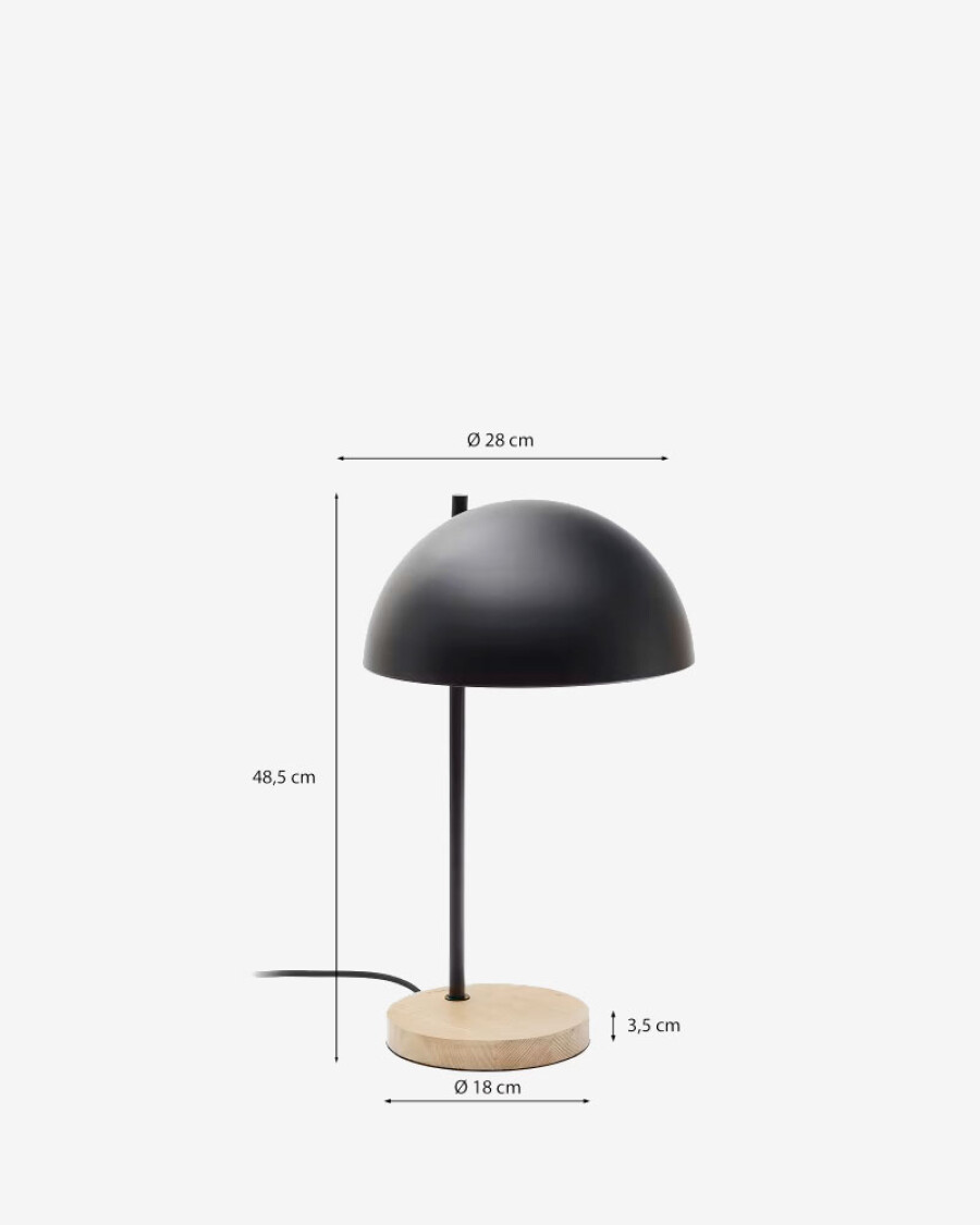 Lámpara de mesa hecha de metal con acabado pintado negro.